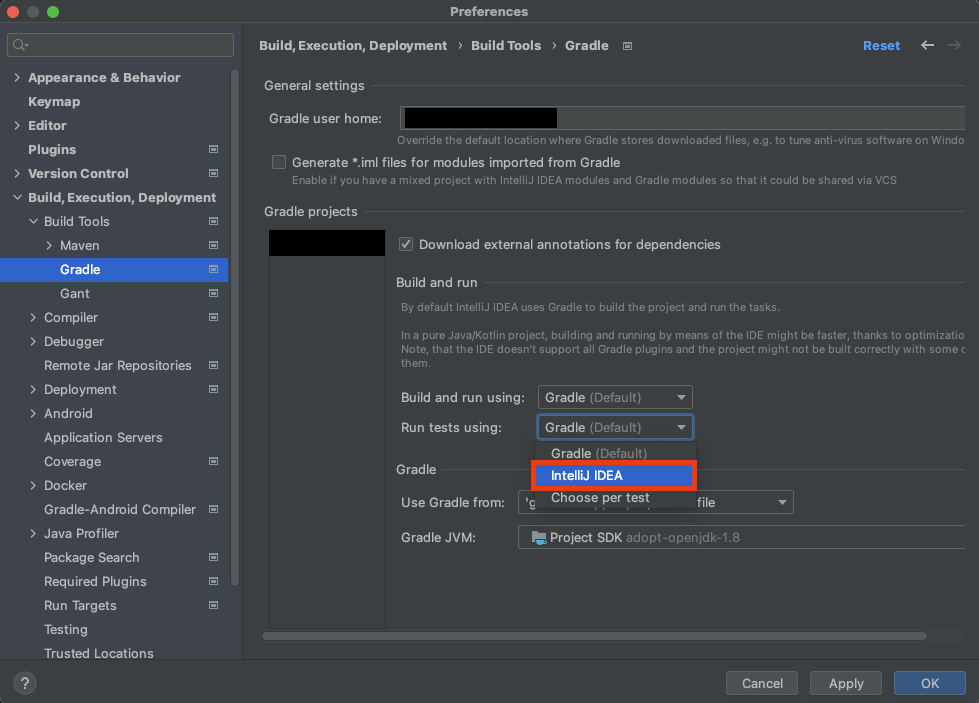 Settings > Build, Execution, Deployment > Build Tools > Gradle 설정에서 Run tests Using 옵션을
