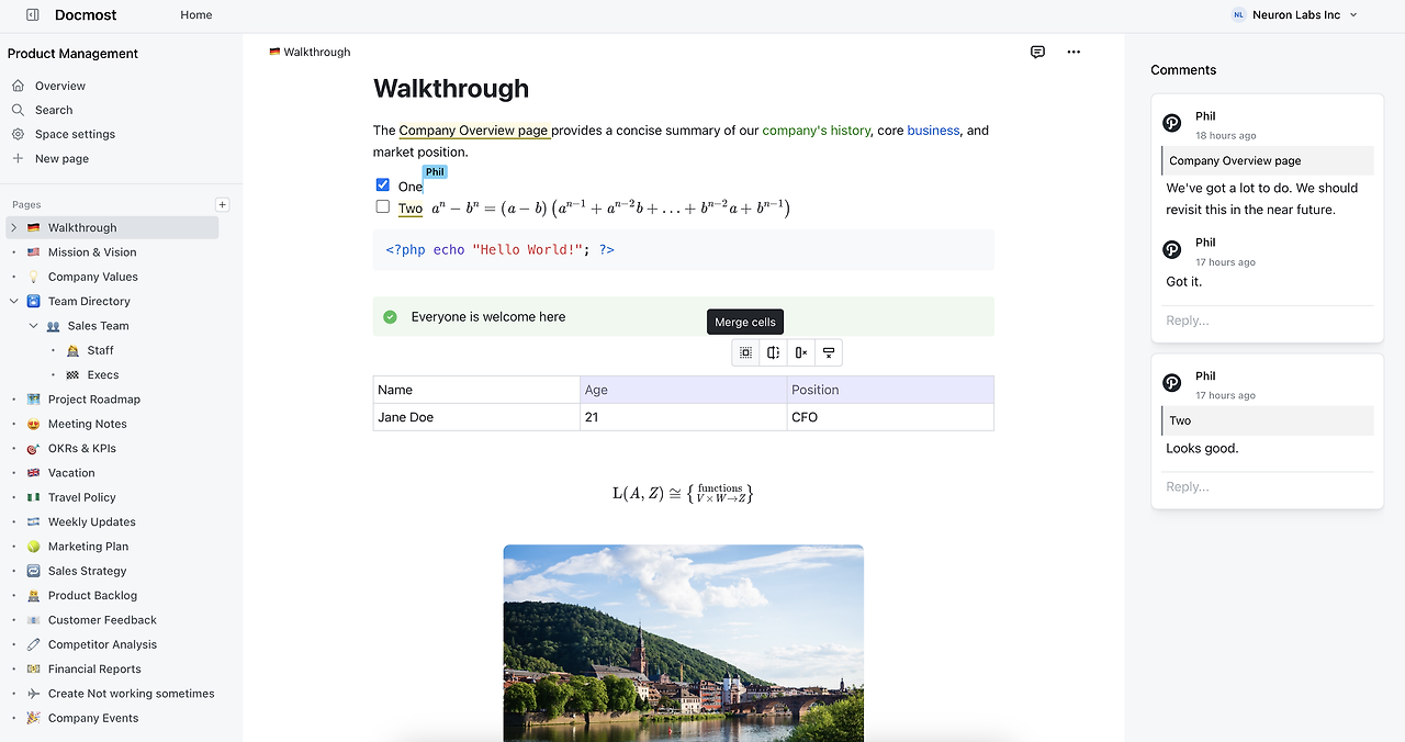 스크린샷을 보면 알 수 있듯 Notion과 비슷한 UI를 채택하였습니다. 설치는 Docker를 통해 아주 쉽게 할 수 있습니다. 설치와 관련된 자세한 정보 https://docmost.com/docs/installation 문서를 참조하시면됩니다.