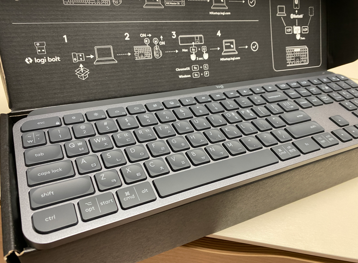 MX Keys S 키보드는 평소에 사용하던 기계식 키보드와 다른 키 배치와 키감이라 적응이될까 싶었는데, 일하면서 사용하니 금새 적응이되었습니다. 키압이 높지 않아 타이핑 할 때 부담이 없고 조용하고, 블루투스 전환이 빨라 만족스럽습니다.