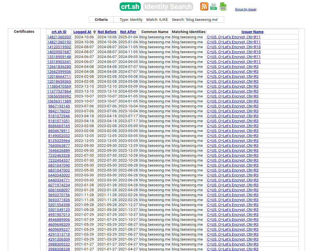 도메인의 이력을 조사하다 특정 도메인의 SSL / TLS 인증서 발급 조회를 제공하는 crt.sh 사이트를 알게되었습니다.