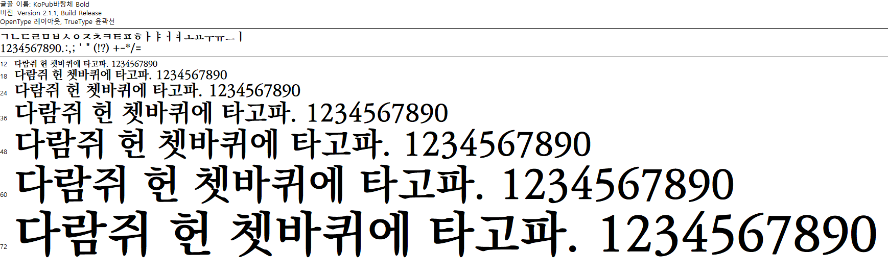 KoPub 서체는 문화체육관광부와 한국출판인회의에서 전자책 제작 및 전자출판 유통시장 화성화를 지원하고 출판업계와 전자출판 산업 발전을 도모하기 위해 제작되었고, 문화체육관광부와 한국출판인회의에서 지적재산권을 가진 서체입니다.