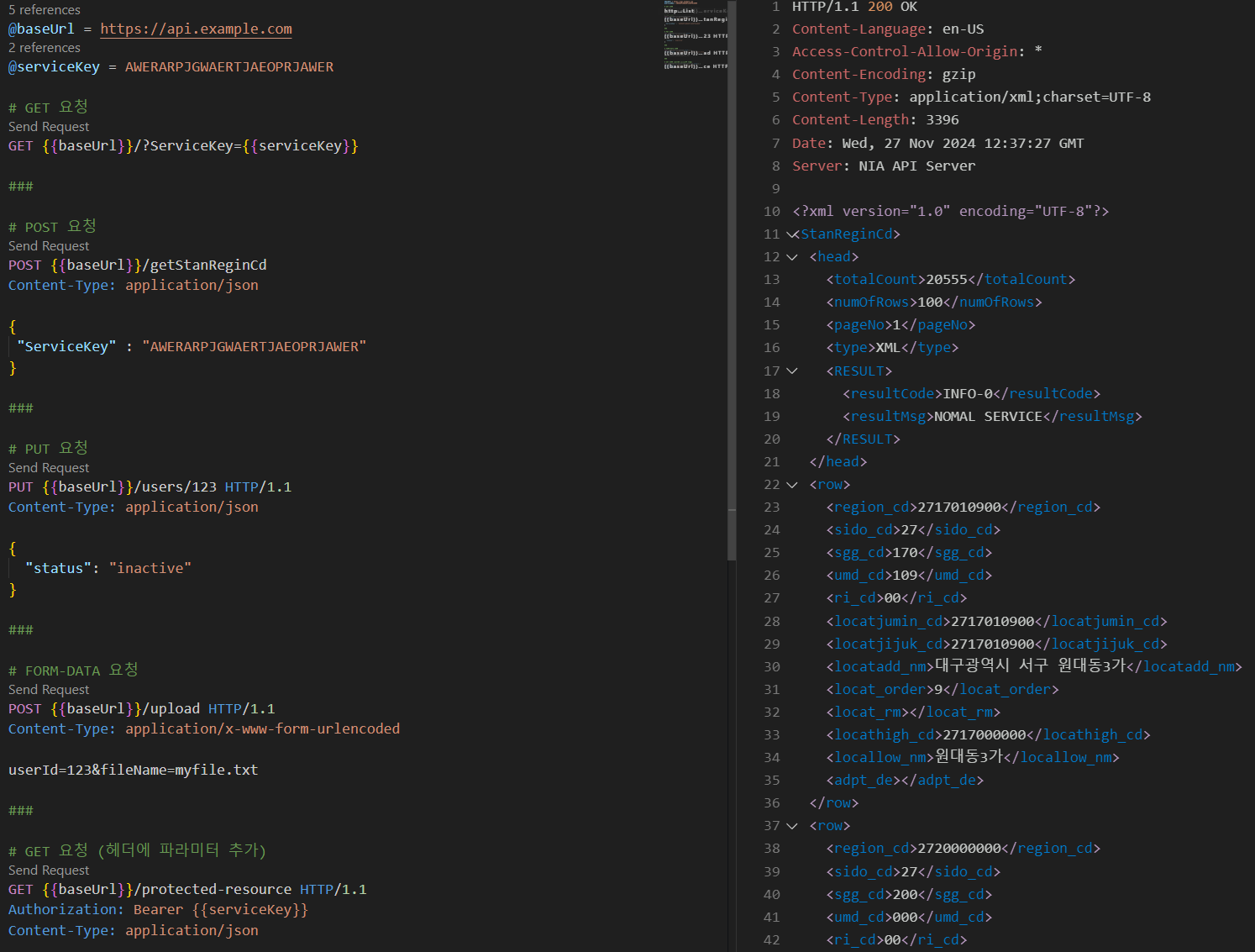 위와 같이 변수를 선언해서 API마다 반복되는 값들을 따로 관리할 수도 있고 하나의 .http 파일에서 여러가지 API를 사용할 수도 있습니다. .http 파일만 형상관리한다면 협업하는 동료들과도 문서 처럼 활용할 수 있습니다.