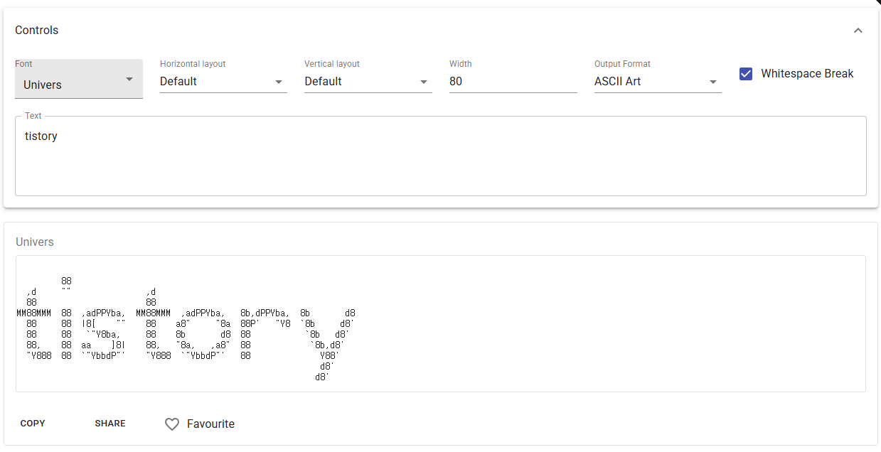 Text 영역에 작성한 문자를 하단에 아스키 아트로 표현해주며, Font 설정을 변경하면 다양한 스타일로 적용할 수 있습니다.