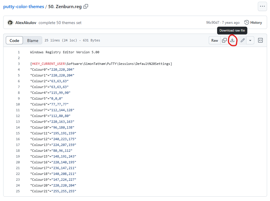 https://github.com/AlexAkulov/putty-color-themes/blob/master/50.%20Zenburn.reg 에 접속 후 Download raw file로 레지스트리 파일을 다운받아 실행하면됩니다.