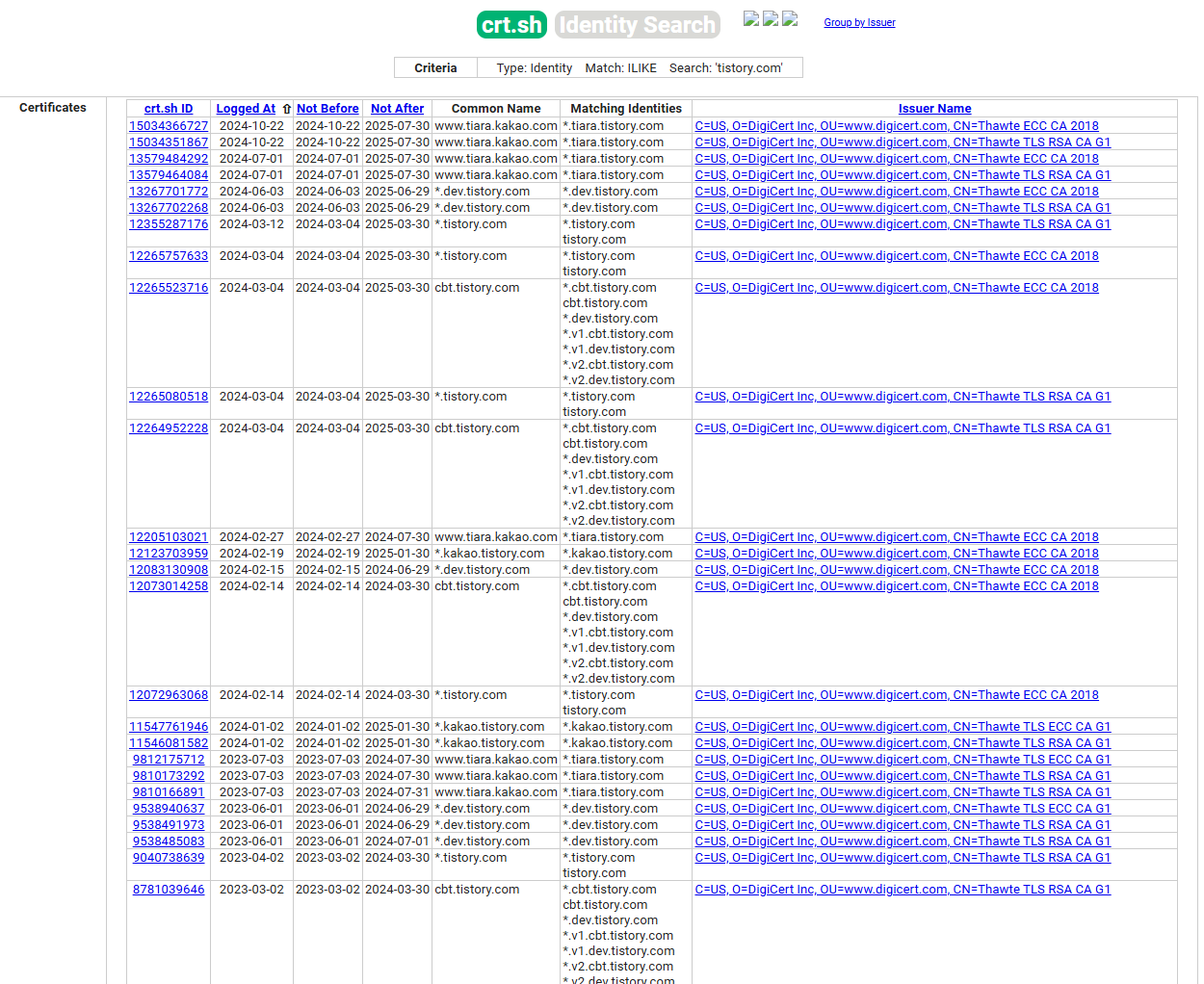 도메인의 이력을 조사하다 특정 도메인의 SSL / TLS 인증서 발급 조회를 제공하는 crt.sh 사이트를 알게되었습니다.